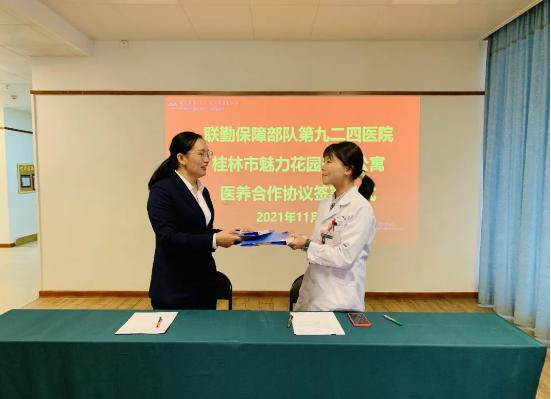 为促进医养结合发展,,,,,,,,日前魅力花园(桂林交控)国际养老公寓与中国人民解放军联勤保障部队第九二四医院签订了《服务居民长期义诊活动协议书》,,,,,,,,今后第九二四医院将为魅力花园养老公寓老年人开通就诊绿色通...