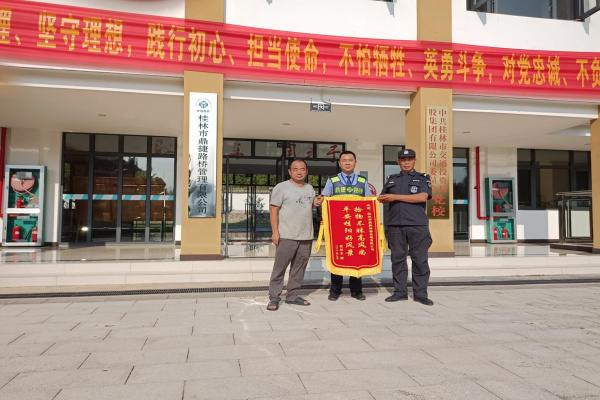 近日,,,,,两位特殊访客来到雁山收费站,,,,,将写着“拾物不昧高风尚,,,,,平安桂阳好风景”的锦旗递交给收费站工作人员。。。。。。。。