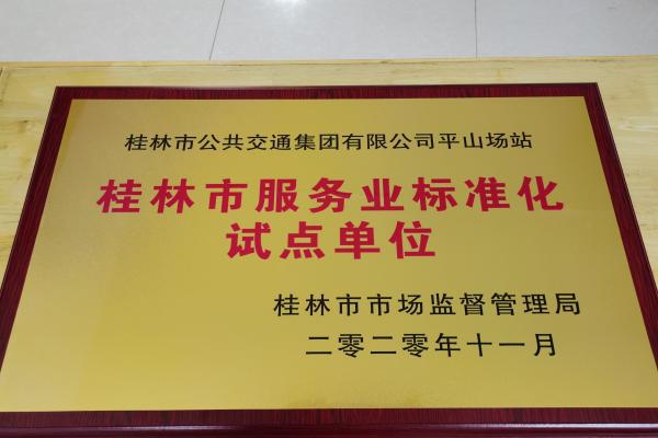 4月22日,,,,,,桂林市市级服务业标准化试点培训会议暨桂林市级第四批服务业标准化试点单位表彰大会召开,,,,,,会议对桂林市18家服务业及社会事业领域标准化试点单位进行了表彰,,,,,,桂林交通控股公交集团平山场站,,,,,,阳朔山水旅游运输有限公司被授予桂林市服务业标准化试点单位称号。。。。。