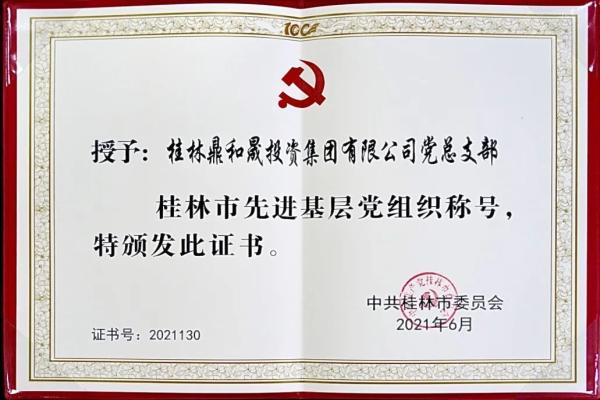 在庆祝中国共产党成立100周年之际,,,,,,,,桂林鼎和晟集团党总支被中共桂林市委员会授予“桂林市先进基层党组织”称号。。。。。。。