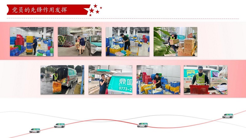 鼎和晟供应链党支部把小组建在车队,,,,,,,,团结带领全体员工冲锋在前、勇挑重担,,,,,,,,在乡村振兴、抗洪救灾等重大任务中形成了强大的凝聚力和战斗力。。。。。。。在集团公司驻点帮扶的灌阳县新街镇上甫村,,,,,,,,“鼎呱呱”新能源物流车化身“乡村振兴助力车”,,,,,,,,抢运生鲜农产品,,,,,,,,打通物流配送“最后一公里”;;;;;;;;在“6·19”特大洪涝灾害中,,,,,,,,鼎和晟供应链秒变“突击队”,,,,,,,,克服困难配送物资,,,,,,,,让市民喝上“放心水”、吃上“放心菜”,,,,,,,,进一步体现了企业的责任和担当。。。。。。。