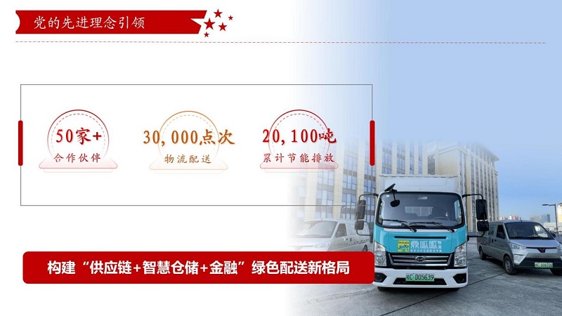 鼎和晟供应链党支部深刻认识创新驱动发展的重要性,,,,,,,,积极响应国家“双碳”目标,,,,,,,,以钉钉子的精神打好改革攻坚战,,,,,,,,将绿色发展理念融入企业战略,,,,,,,,算“经济账”的同时还算“环保账”,,,,,,,,为经销商提供定制化绿色服务。。。。。。。截至目前,,,,,,,,合作伙伴超50家,,,,,,,,配送点次近3万次,,,,,,,,上半年累计节能排放约2.01万吨,,,,,,,,构建起绿色配送新格局。。。。。。。