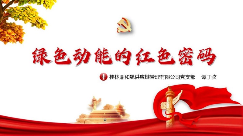 线上微党课:《绿色动能的红色密码》 讲师:桂林鼎和晟供应链管理有限公司 谭丁弦 课程介绍:该课程紧扣党的二十届三中全会提出的“加快完善落实绿水青山就是金山银山理念的体制机制”,,,,,,,,结合鼎和晟供应链公司工作实例,,,,,,,,从党建引领、党建品牌建设、阵地建设等多个角度,,,,,,,,就如何发挥党组织堡垒作用和党员先锋模范作用进行分享,,,,,,,,给创新基层党建工作提供了思考和启发。。。。。。。 微党课回放: 绿色,,,,,,,,作为中国式现代化的鲜明底色,,,,,,,,意义重大。。。。。。。党的二十届三中全会提出完善生态文明制度体系、加快完善落实绿水青山就是金山银山理念的体制机制的要求,,,,,,,,站在历史新起点,,,,,,,,桂林鼎和晟供应链管理有限公司积极承担国企社会责任,,,,,,,,以党建为引领探索企业绿色健康发展之路。。。。。。。
